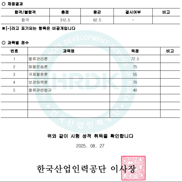 안녕하십니까 저는 2025년 제29회 물류관리사를 합격을 한 시대에듀 환급반 수강생 홍성빈입니다